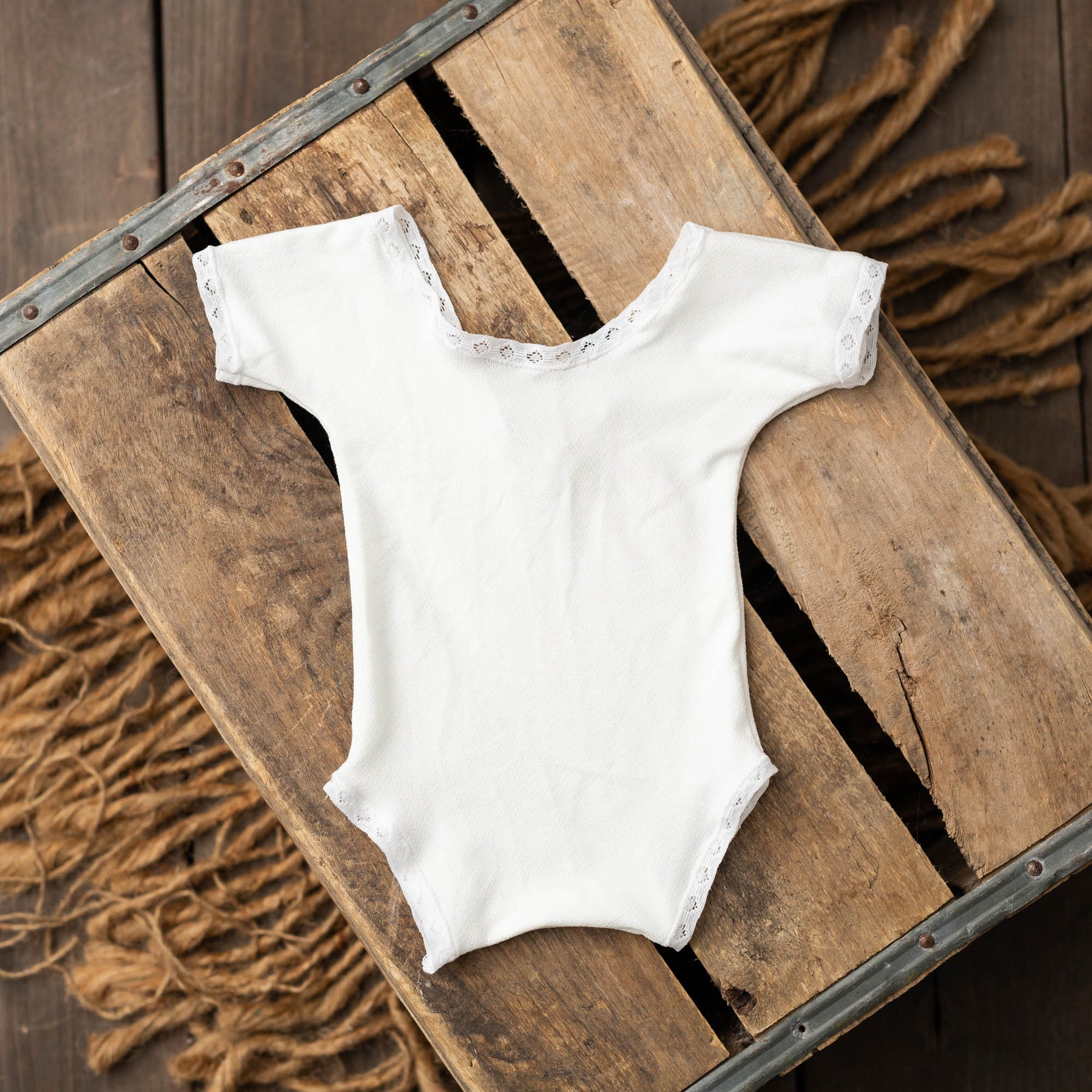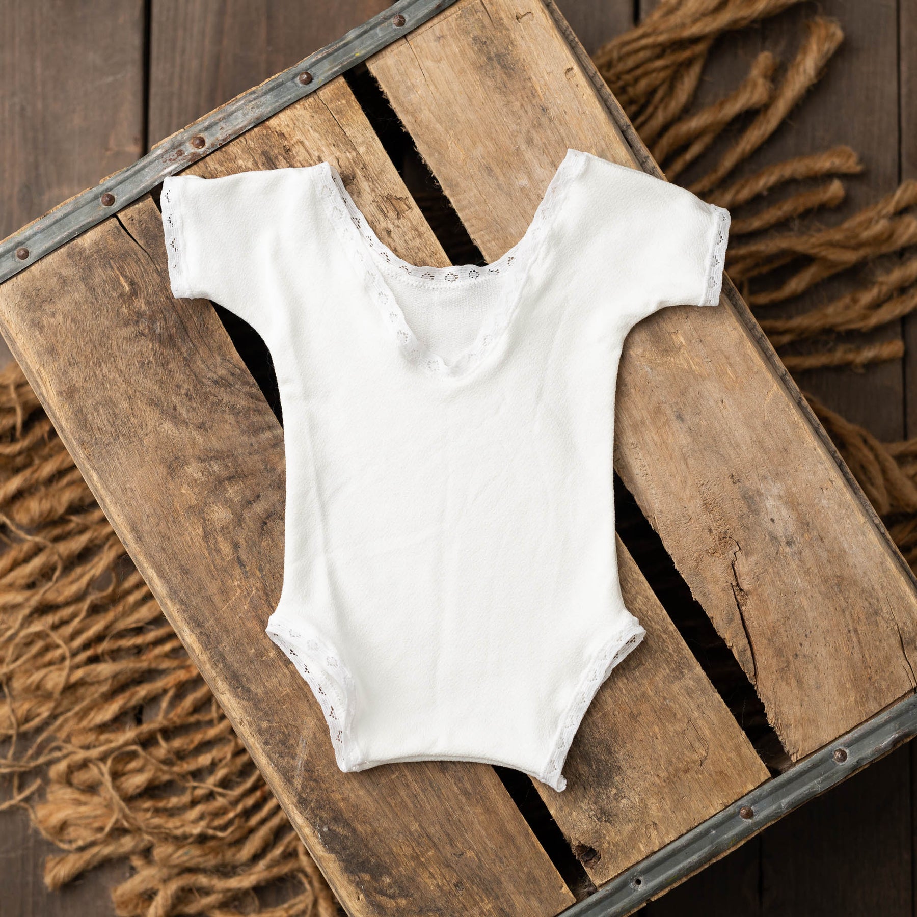 This newborn prop outfit is made out of a super lightweight stretchy fabric with a beautiful subtle linen texture. The barely there cap sleeves are adorable along with the wide opening in the back to show off those cute baby rolls! This baby outfit has ties in the back to keep the sleeves on the shoulders as well as add a cute detail in the back.