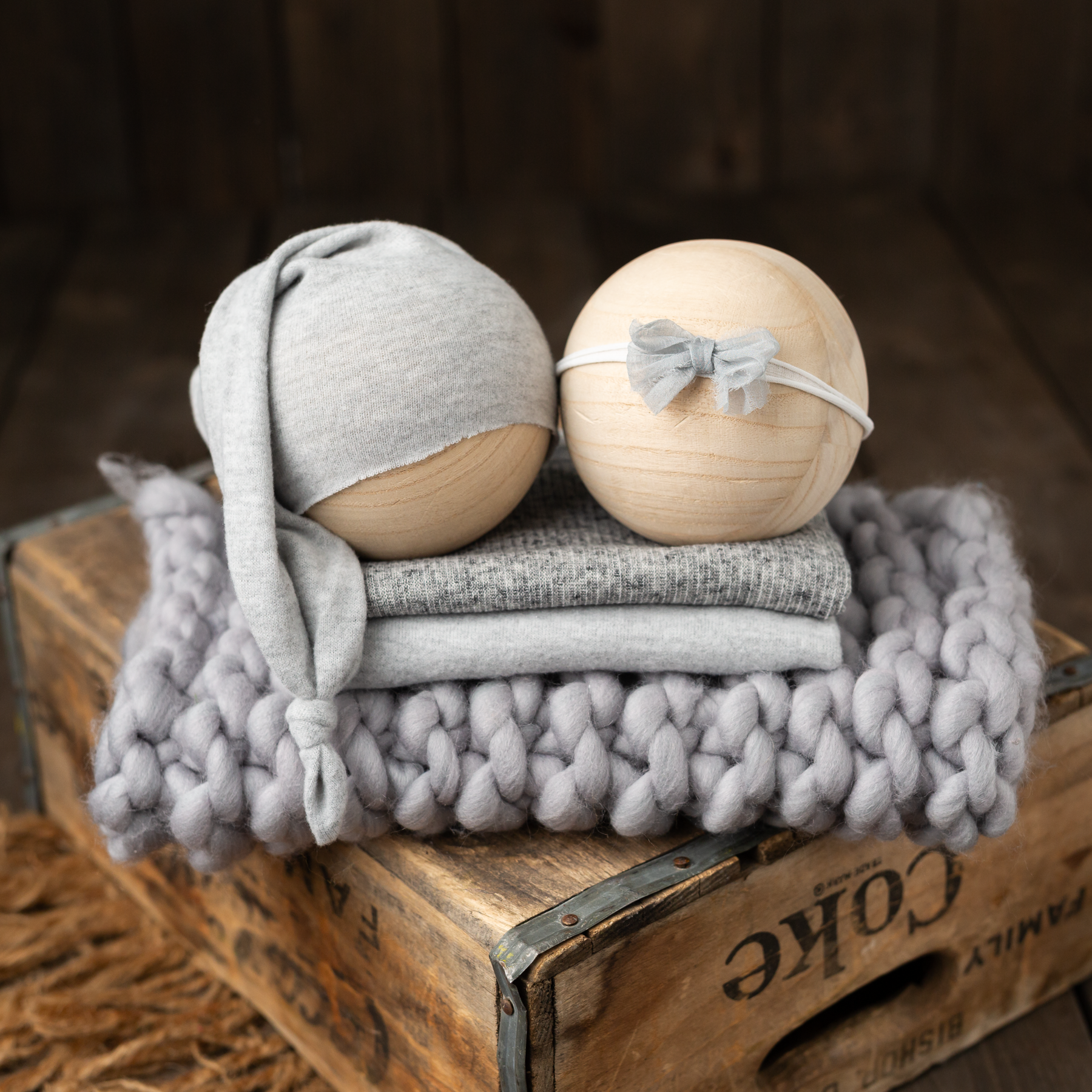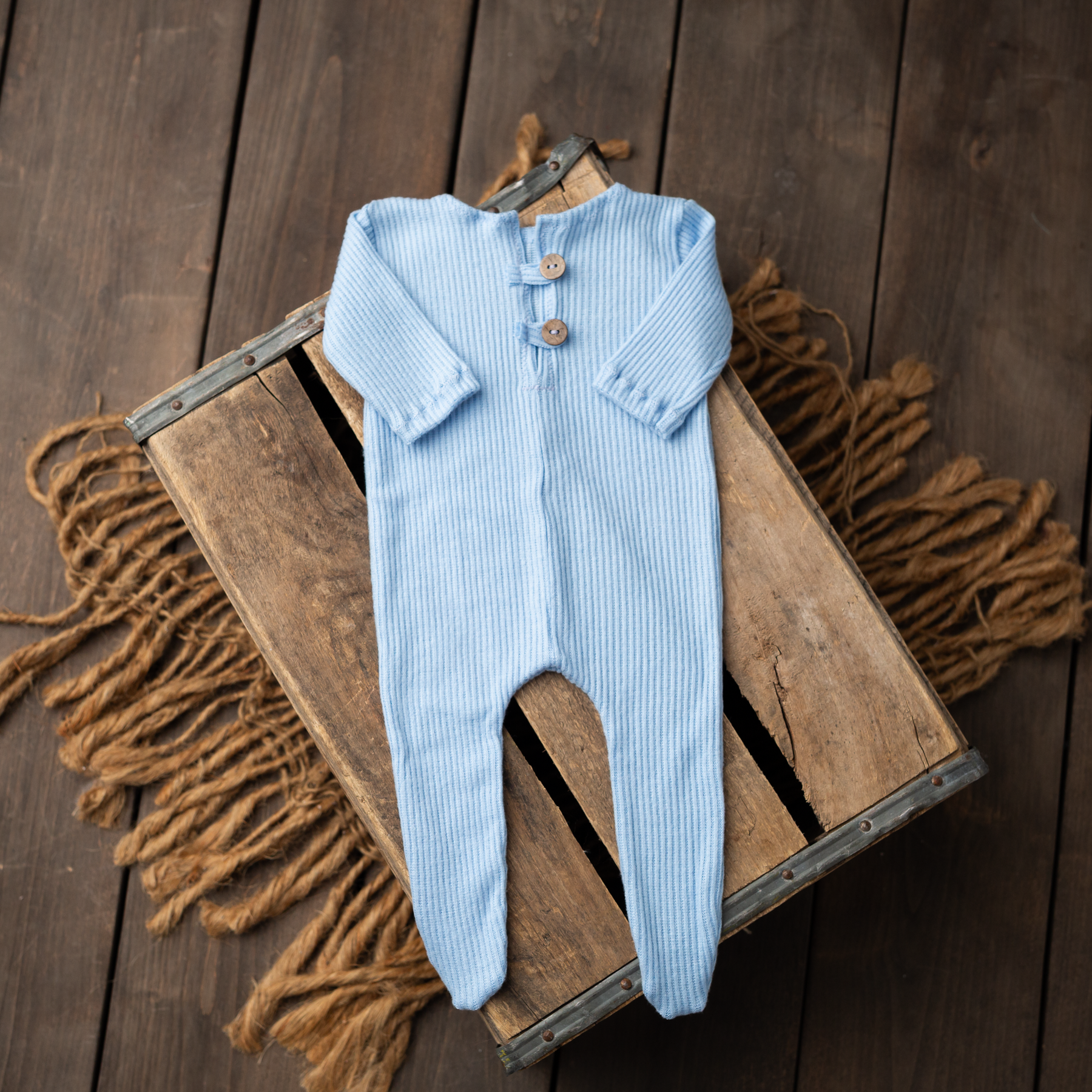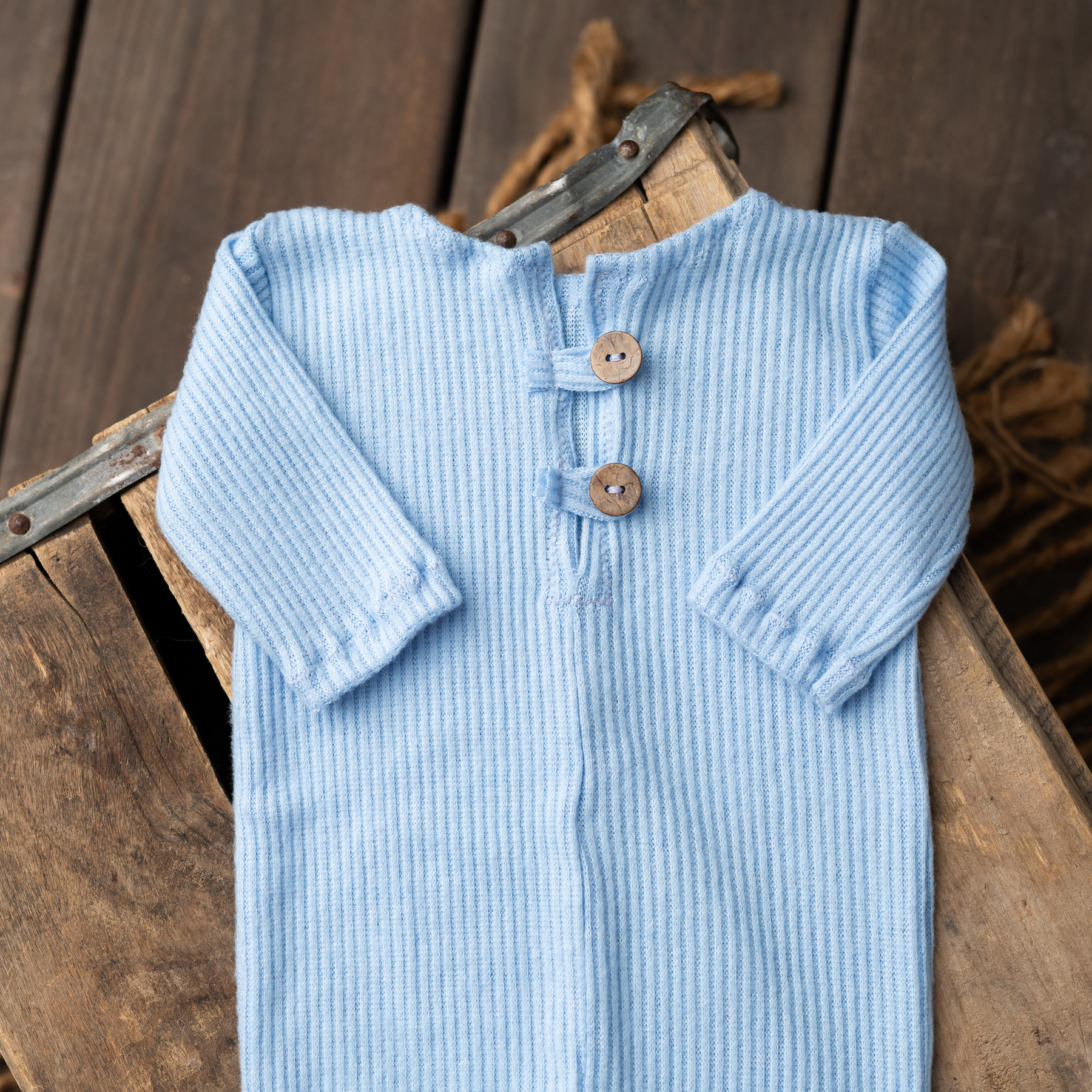 Add a touch of elegance to your newborn sessions with this newborn romper. This grey outfit has a subtle purple undertone with a gentle, neutral feel that photographs beautifully in newborn setups. Crafted from soft, stretchy fabric that feels gentle on delicate skin, this timeless piece features long sleeves and sweet wooden button details for a look that is classic yet modern.