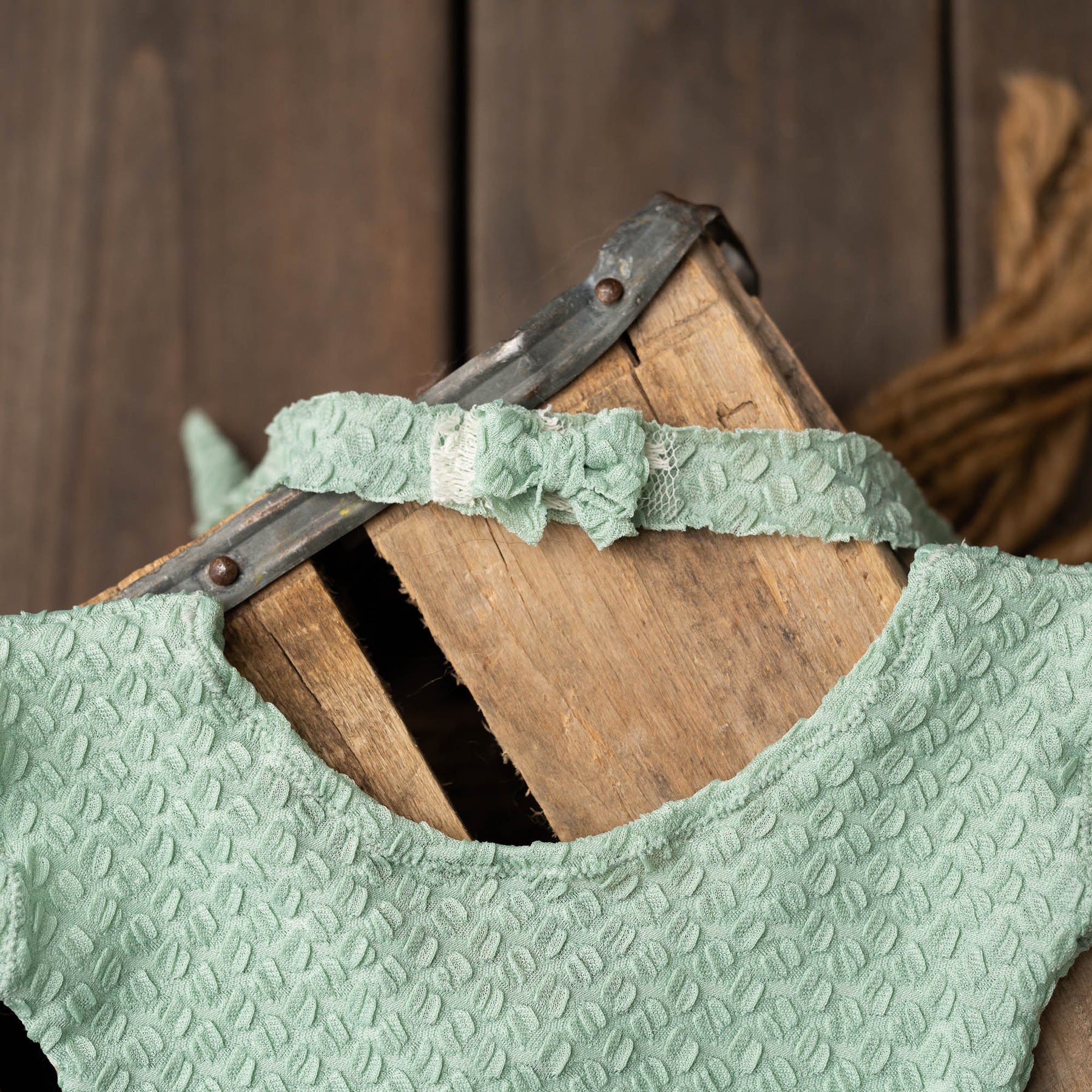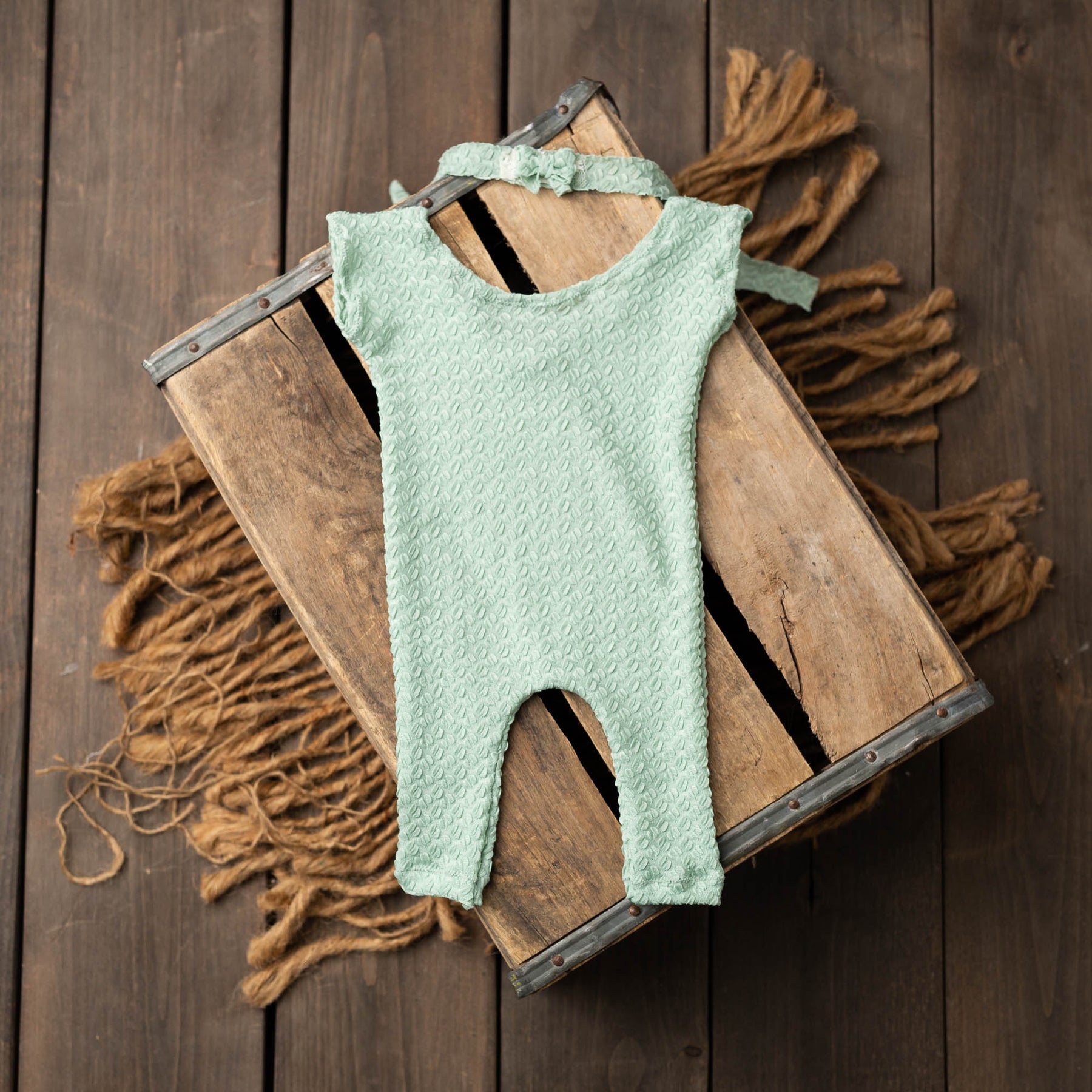 An adorable newborn romper with cap sleeves and a slightly lower back for a super feminine and simple option for your newborn photography sessions! This outfit is made with a unique textured fabric that is super stretchy to fit a wide range of sizes and includes a matching tieback!